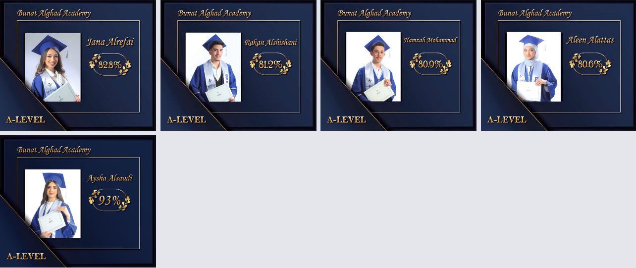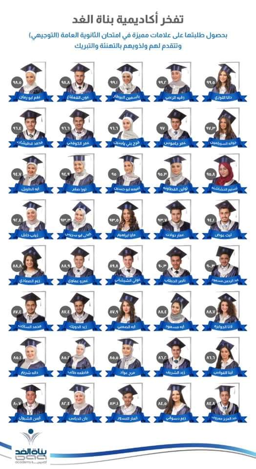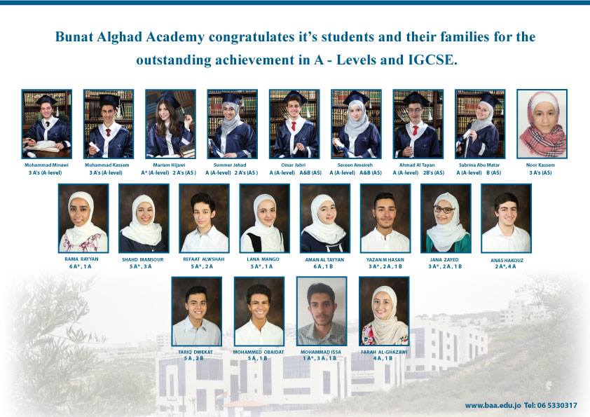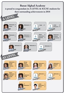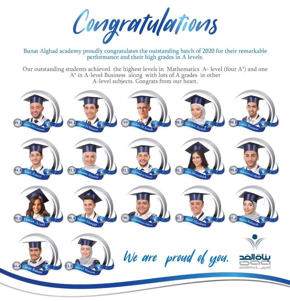 Bunat Alghad Academy proudly congratulate our students and their parents for the outstanding results in the General secondary examination (tawjihi), the scientific stream.